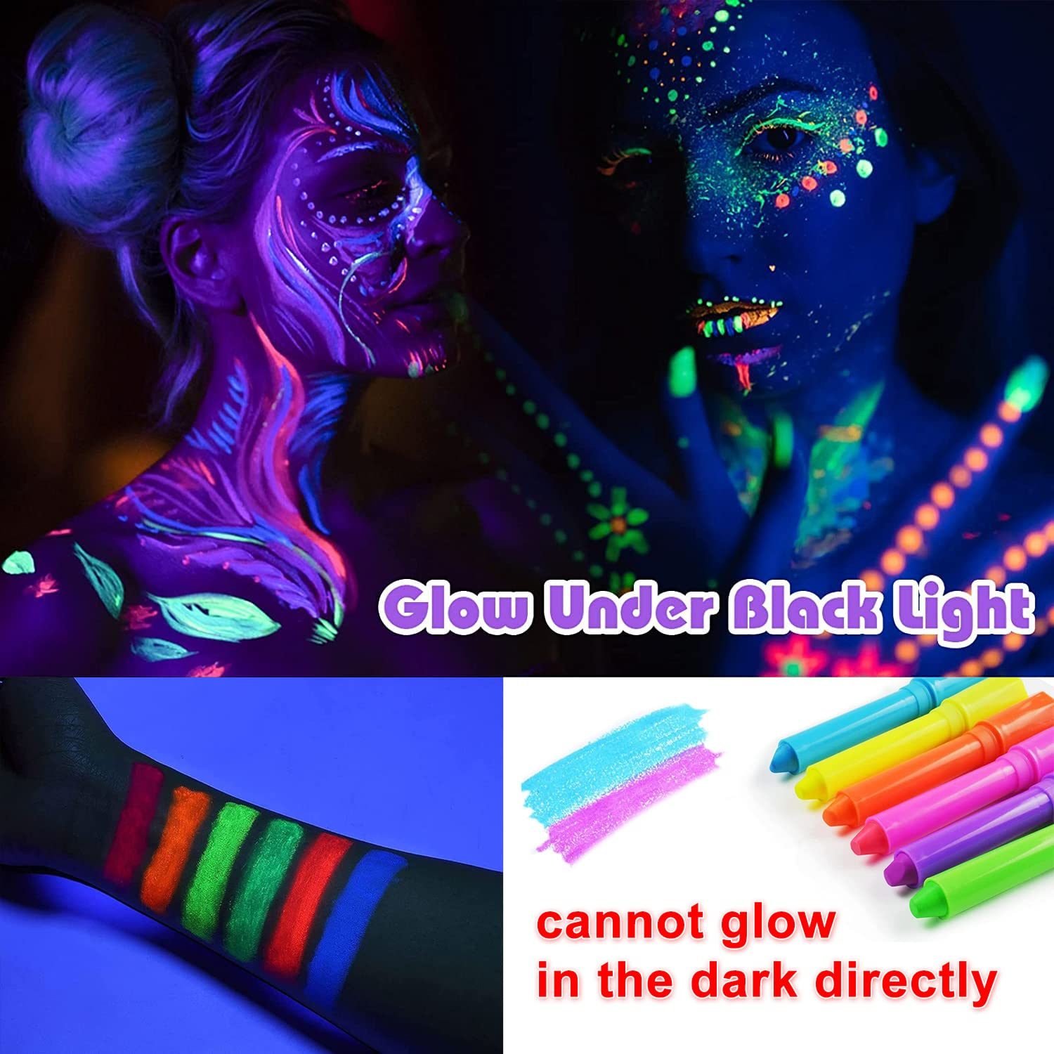 1.GLOW IN THE BLACKLIGHT PAINT: The fluorescent face paint present vivid colors under natural light, after we use these crayons for face and body painting, the makeup can glow spectacularly under black light, but they cannot glow in the dark directly.