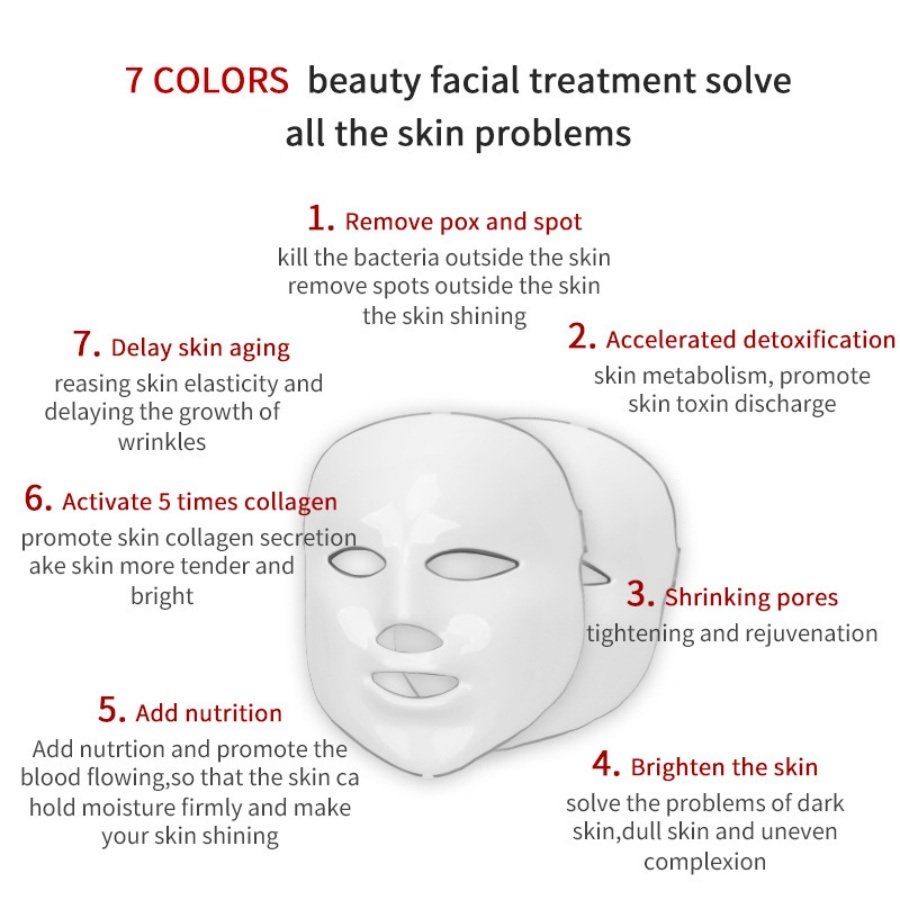 2.LED mask provides 7 colors(red,blue,yellow,green,purple,white,cyanine),different colors have different effects. Each light (which does not produce heat) provides different effects for specific skin problems. It can meet your various beauty needs. The best choice for home facial beauty equipment!