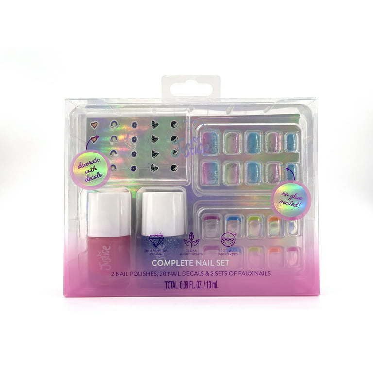 You glow, girl! Our Justice™ Complete Nail Set includes everything you need to decorate your digits in different looks! Two sets of fashion press-on nails elevate your style! Set 1 has a multicolor soft ombré gradient effect with silver glitter accents. Set 2 has a clear base with bright, multicolored French tips. No glue needed for either set – just press them on and go! Two 6.5oz each nail polishes are included in different finishes – hot pink opaque solid and blue glitter. Both work with any skin type to deliver rich, highly pigmented color that are environmentally friendly and free from toxins. Layer them or use alone for a different look! Finish your nail art looks by decorating with cute nail decal stickers, customizing your nails and making them stand out! Hearts, rainbows, flowers, butterflies and yinyangs add a fashionable decorative look.