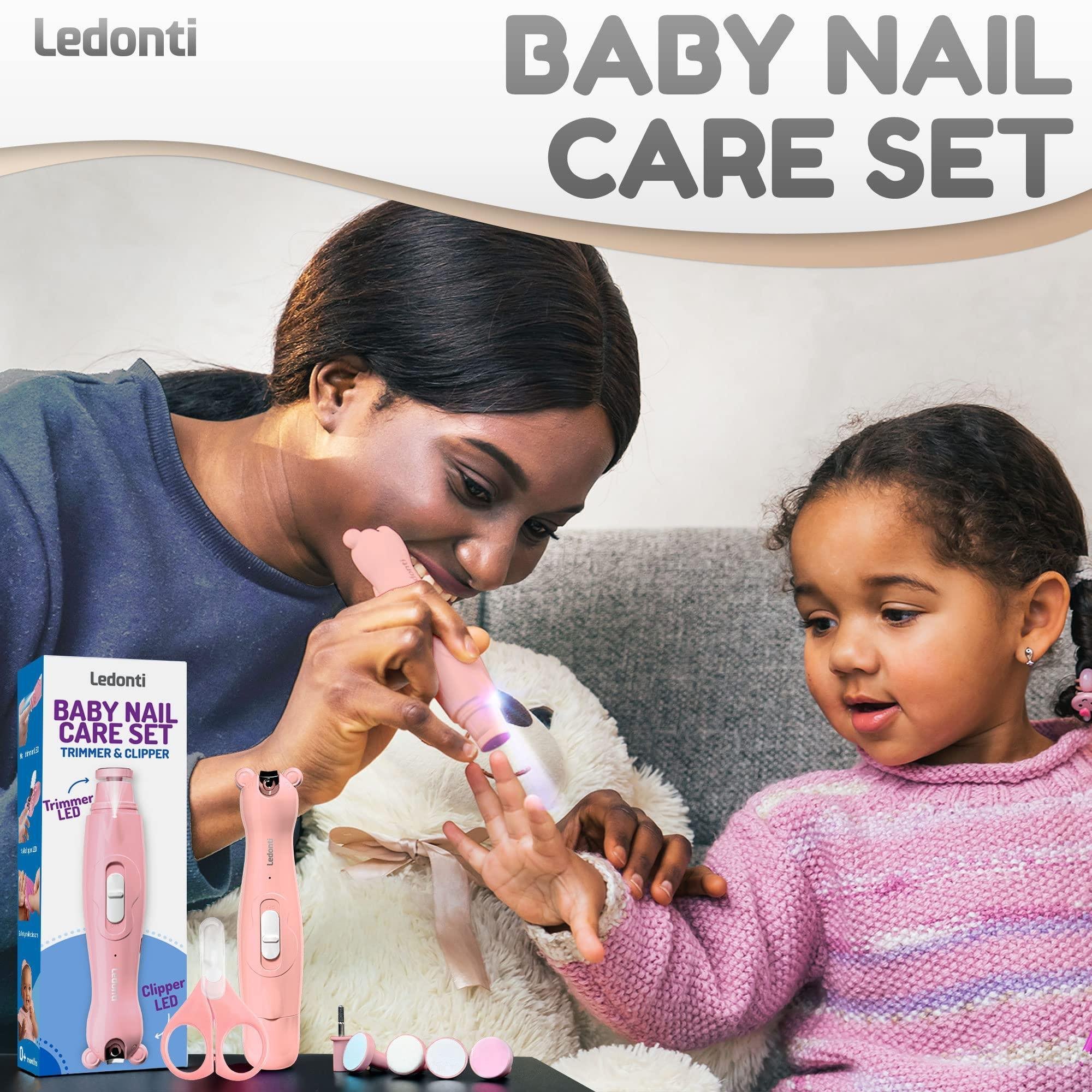 1.all-in-one baby nail kit for safe nail care of babies, kids, and their parents. baby nail trimmer electric led with 6 replaceable grinder heads and sandpapers. safety clippers with curved steel blades and led light. ultra-safe scissors with a protective cap. a convenient storage bag. get a professional nail care set for the whole family.