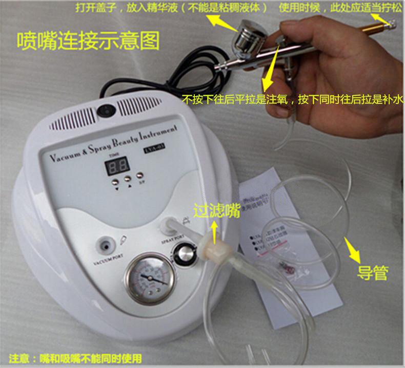 Take out the machine, connect the power; Connect the injection gun and the oxygen tube; Turn on the red power switch on the machine surface; when there is "buzzing" sound the instrument, the instrument starts work;open the lid injection cup, which installed liquid products such as whitening moisturizer (Note that no viscous liquid products or water);Press switch of the oxygen injection gun, product will spray. (For the structure, see the structure description).